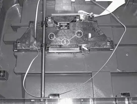 6. Очищают безворсовой салфеткой оптические элементы и лампу сканера. Собирают каретку в обратной последовательности, после чего устанавливают ее в блок сканера. При необходимости очищают от смазки и загрязнений направляющую каретки и наносят тонкий слой смазки.