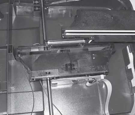 Примечание. Для снятия крышки разъем лампы сканера можно не отключать. При этом аккуратно укладывают провода в пазе прокладки и, увеличивая свободную длину кабеля на величину, необходимую для выхода направляющих крышки из пазов, сдвигают (выводят из пазов) крышку, после чего отводят ее в сторону для обеспечения доступа к оптике сканера (рис. 36).