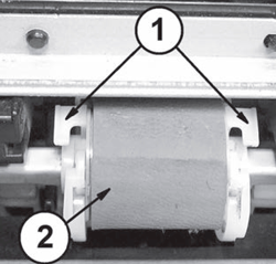 2. Нажимают на фиксаторы (1 на рис. 26), удерживающие ролик захвата бумаги (2), и снимают его с принтера. Осматривают ролик и очищают его от загрязнений. При износе (нет захвата бумаги) или повреждении ролик подлежит замене. Устанавливают ролик в порядке, обратном снятию.