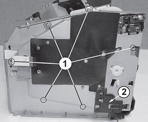 3. Откручивают четыре винта (2 на рис. 36) и снимают блок лазера с принтера.