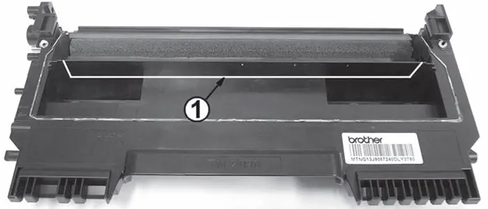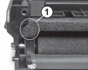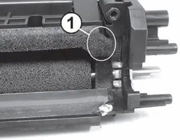 2.Располагают корпус тонер-картриджа валом подачи тонера к себе, крышкой заправочного бункера вверх. Аккуратно отклеивают поролоновые уплотнители от корпуса картриджа в зоне фетровых уплотнителей вала проявки с левой (1 на рис. 11) и правой (1 на рис. 12) сторон вала.