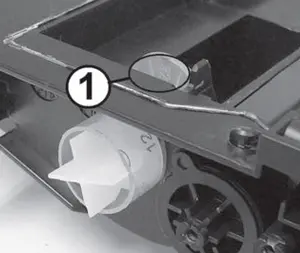 5. Располагают корпус картриджа валом подачи от себя (рис. 15). Ножом аккуратно удаляют (срезают) перегородку между отделениями заправочного бункера по нижнему уровню полости (1 на рис. 15), соединяющей карманы между собой (на рис. 15 обозначена линия удаления перегородки). При удалении перегородки с левой и правой сторон оставляют примерно по 10 мм перегородки для центровки крышки при ее установке.
