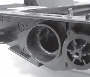 2. В картридже с левой стороны (сторона, противоположная редуктору) по центру кармана сверлят отверстие, равное диаметру корпуса шприца. Очищают заправочный бункер и корпус картриджа от стружки.