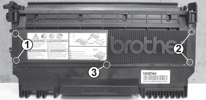 11. Устанавливают на место крышку редуктора, закручивают три самореза крепления крышки к корпусу. При необходимости очищают внешнюю поверхность тонер-картриджа пылесосом.