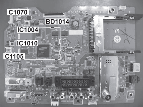 Если эти напряжения имеются, проверяют наличие напряжений 3,3 В (A3.3V_PW и B3.3V_PW на рис. 16 и в контрольной точке BD1014 на рис. 17) и 1,25 В (A1.25V_PW на рис 16 и в контрольной точке С1105 на рис. 17). Если отсутствует хотя бы одно из этих напряжений, проверяют исправность микросхем IC1004 и IC1010 (см. рис. 16 и 17) платы MAIN BOARD и их внешних элементов.
