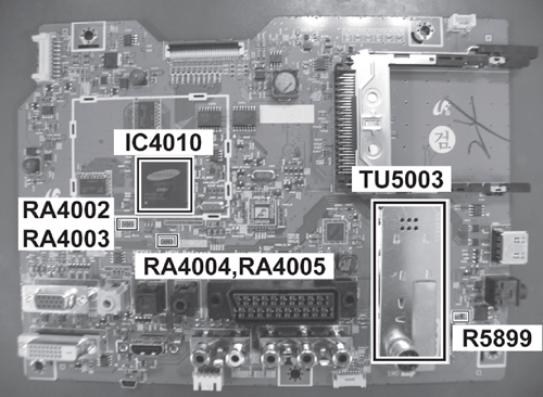 Проверяют надежность подсоединения кабеля HDMI и наличие сигналов цифровых данных в контрольных точках D6005, D6007 (HDMI 1) или D6008, D6010 (HDMI 2) (рис. 21). При их отсутствии заменяют кабель HDMI. При наличии этих сигналов данных проверяют сигналы на входах микросхемы IC4010 платы MAIN BOARD в контрольных точках RA4004, RA4005 (HDMI 1) или RA4002, RA4003 (HDMI 2) и при их отсутствии проверяют исправность микросхемы IC4010 и ее внешних элементов.