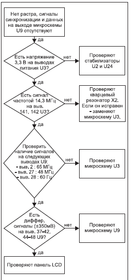 Нет растра, сигналы синхронизации и данных на выходе микросхемы U9 отсутствуют (рис. 12);