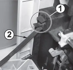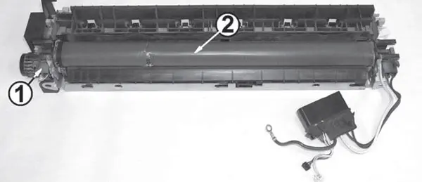 4.С левой стороны узла термозакрепления освобождают фиксаторы (1 на рис. 8) разъема (2) подключения узла к принтеру и снимают его с пластмассовой боковой крышки.