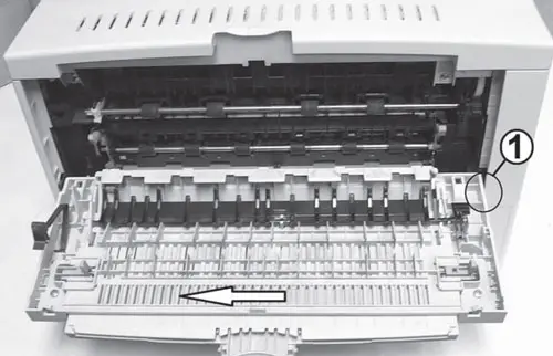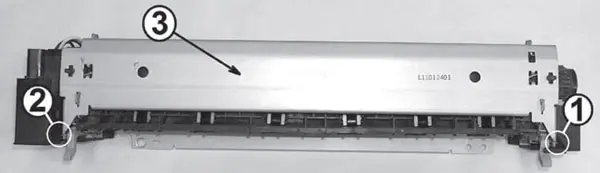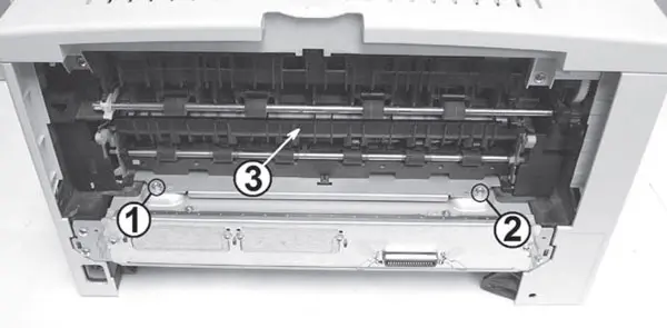 Открывают крышку доступа к картриджу, вынимают картридж из принтера и помещают его в оригинальную упаковку или в темный полиэтиленовый пакет. Отключают кабель подачи питания и интерфейсный кабель от принтера, располагают принтер задней стороной к себе. Открывают крышку узла термозакрепления, освобождают фиксатор (1 на рис. 1) и отсоединяют ограничительную тягу (2). Располагают крышку горизонтально (рис. 2), перемещают ее в левую сторону, вынимают правую ось (1 на рис. 2) крышки из посадочного отверстия, отводят правую сторону крышки к себе и, далее, переместив крышку вправо, снимают ее с принтера. Откручивают два винта (1 и 2 на рис. 3) крепления узла термозакрепления (3), немного приподнимают узел вверх (до выхода ориентирующих выступов с отверстий, расположенных возле винтов крепления) и, переместив узел термозакрепления к себе, снимают его принтера.
