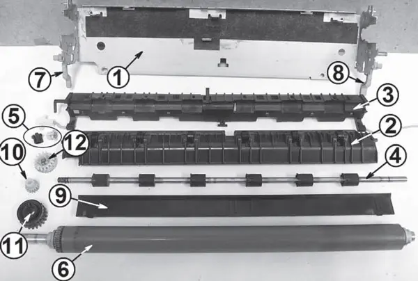 -верхняя направляющая выхода бумаги (2) в сборе с роликами прижима бумаги к выходному валу;