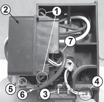 6.Откручивают винт (7 на рис. 8) и снимают левую пластмассовую крышку в сборе с датчиком бумаги с узла термозакрепления.