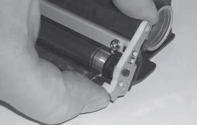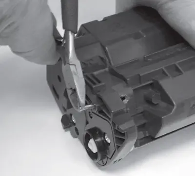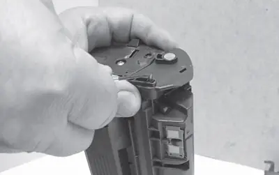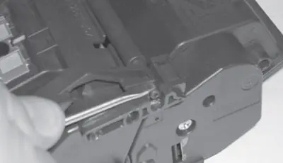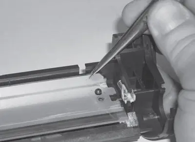 3. Приподнимают правую часть шторки и одновременно извлекают ось из посадки в левом пазу корпуса картриджа. Снимают защитную шторку фотобарабана. При извлечении оси шторки из паза, во избежание ее поломки, соблюдают осторожность. Усилие на ось шторки необходимо прикладывать как можно ближе к месту посадки в корпус. При снятии оси шторки обращают внимание на расположение возвратной пружины для правильной ее установки на место при сборке картриджа.