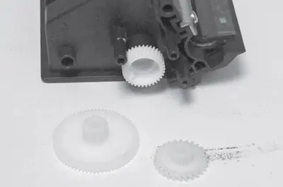 18. Снимают шестерни редуктора привода активатора (предварительно запоминают их расположение) и с помощью кисти и пылесоса очищают их от тонера (рис. 16).