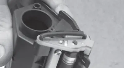 2. Нажимают на выступ, расположенный на оси шторки с левой стороны, слегка приоткрывают шторку. Вставляют узкую плоскую отвертку между осью шторки и корпусом картриджа с правой стороны, а затем аккуратно выводят ось из паза в корпусе (рис. 2).
