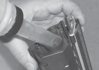 Для засыпки тонера в заправочный бункер применяют обычную воронку с выходным отверстием подходящего диаметра. Однако на практике удобнее использовать приспособление, изготовленное из крышки от банки с применяемым тонером и фрагмента одноразового медицинского шприца. Изготовление данного приспособления было рассмотрено в [1]. При использовании рассматриваемого приспособления снижается количество тонера, попадающего в воздух при заправке, и, соответственно, в дыхательные пути заправщика. Помните, вдыхание воздуха, содержащего частицы тонера, опасно для здоровья, поэтому при заправке настоятельно рекомендуется пользоваться респиратором.
