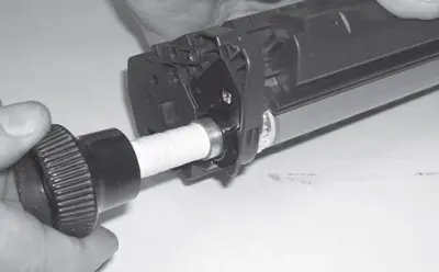 5.3. Придерживая фотобарабан за пластмассовую шестерню, колебательными движениями распределяют тонер, находящийся в бункере отработки, по дальней стенке бункера. Это необходимо для исключения просыпания тонера из бункера отработки при снятии фотобарабана.