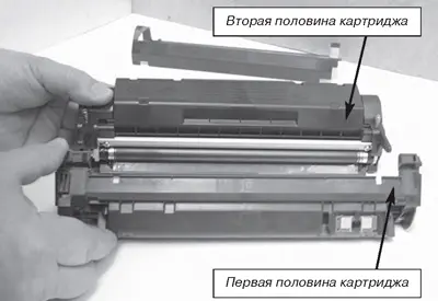 Отодвигают дальнюю половину картриджа от себя, разъединяют его корпус на две части (рис. 7). Операции 5-12 выполняют с ближней половиной картриджа, на которой установлены фотобарабан, чистящее лезвие (ракель), лезвие подбора тонера, вал первичного заряда и бункер отработки (далее по тексту - первой половиной). Операции 13-34 выполняют с дальней половиной картриджа, где находится магнитный вал, дозирующее лезвие, уплотняющее лезвие, бункер для заправки с активатором тонера и редуктором привода активатора (далее по тексту - второй половиной).
