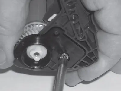 12.7. Вращая шестерню привода фотобарабана по направлению рабочего вращения, проворачивают фотобарабан на 2-3 оборота. При вращении чистящее лезвие очищает барабан от присыпки. Усилие, необходимое для прокрутки, должно быть постоянно.