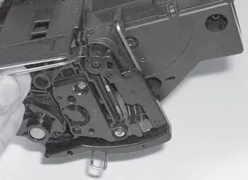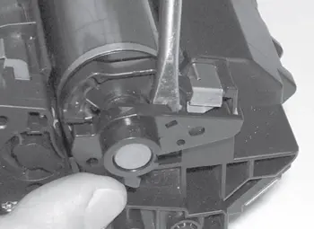 1. Удаляют старую смазку с пластмассовой оси фотобарабана (сторона шестерни). При необходимости с помощью пылесоса и кисти очищают пластмассовую шестерню от тонера и загрязнений. При очистке шестерни фотобарабан удерживают через безворсовую салфетку и не допускают прикосновения к покрытию барабана руками или насадкой пылесоса.