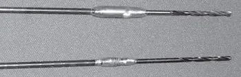 9. С правой и левой сторон на уровне основания ракеля за бушингами вала заряда расположены пластмассовые выступы, закрывающие штифты, соединяющие половины картриджа. Длинным сверлом (длина 160...170 мм) диаметром около 2 мм сверлят отверстия в торце выступа до основания штифта с правой и левой стороны (рис. 9а, б). При сверлении центр отверстия должен совпасть с центром штифта. При отсутствии длинного сверла его изготавливают самостоятельно. Для изготовления хвостовик сверла удлиняют жестким металлическим стержнем через переходную муфту, диаметр отверстия которой с одной стороны соответствует диаметру сверла, а с другой - диаметру используемого прутка. Отверстия в муфте выполняют соосно. Пруток и хвостовик сверла фиксируют в муфте пайкой с применением соответствующего флюса (рис. 10).