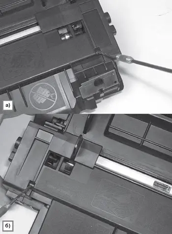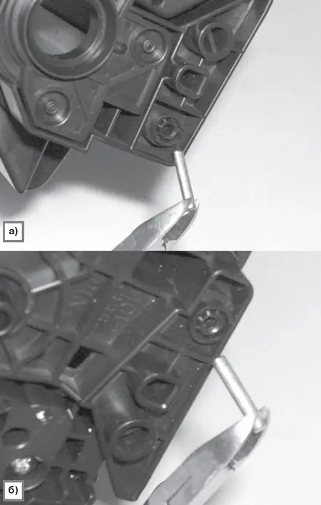 3. С правой стороны за чипом расположено прямоугольное углубление (на уровне штифта). Аналогичное углубление находится с левой стороны картриджа (рис. 13а, б). На месте углублений высверливают пластмассу корпуса до основания штифтов с левой и правой сторон картриджа. Освободить основания штифтов можно также плоской отверткой небольшой ширины с предварительно заточенным лезвием.