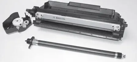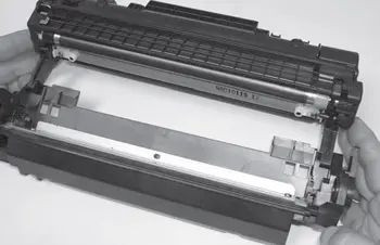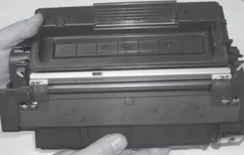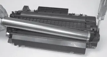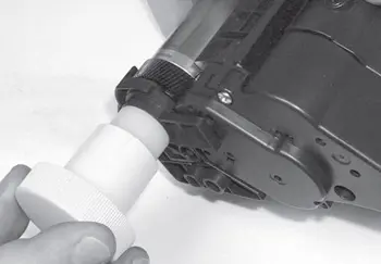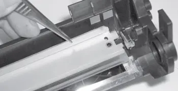 3. Для исключения повреждения поверхности фотобарабана и чистящего лезвия при первом проворачивании после заправки припудривают тальком или тонером рабочую поверхность фотобарабана по длине полосой шириной 15...20 мм.
