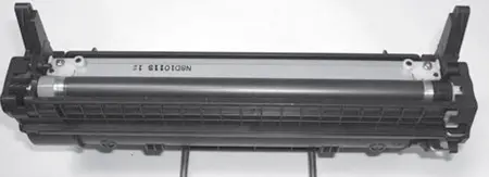 2. Удерживают фотобарабан за шестерню и аккуратно, без сильного нажима, протирают его поверхность безворсовой салфеткой. Осматривают светочувствительный слой фотобарабана. При осмотре обращают внимание на механические повреждения и износ светочувствительного слоя. При обнаружении механических повреждений или повышенного износа, и учитывая качество полученной перед заправкой распечатки, производят замену фотобарабана. При замене фотобарабана чистящее лезвие также подлежит замене.
