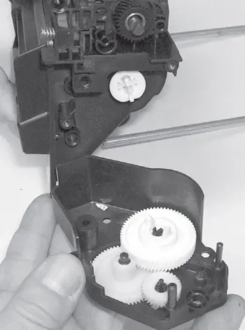 2. Откручивают с левой стороны два самореза крепления корпуса редуктора и снимают его вместе с шестернями (рис. 17), отодвигая параллельно корпусу картриджа и не перекашивая. Это необходимо для исключения поломки пластмассовых штырей, фиксирующих пластину, в отверстии которой вращается магнитный вал.
