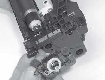 5. Вставляют ось рычага привода в отверстие на шторке и устанавливают рычаг на ось корпуса картриджа. Для исключения поломки фиксатора рычаг привода устанавливают на ось только в закрытом положении шторки. При установке следят, чтобы конец пружины не выскочил из паза на рычаге. Поворачивают рычаг и устанавливают конец пружины привода защитной шторки на упор в корпусе.