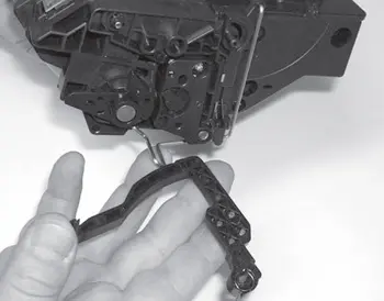 6. Располагают ближнюю половину бункером отработки к себе, фотобарабаном вверх (шестерня расположена справа), снимают ось фотобарабана и шторку контакта вала заряда вместе с пружиной привода (операция 5 разборки первым способом).