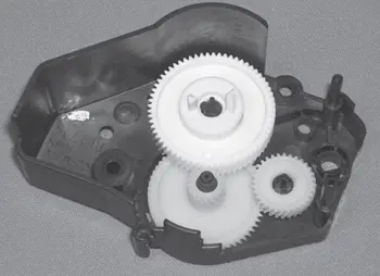 14. При необходимости очищают корпус редуктора привода активатора и пластмассовые шестерни редуктора от тонера и загрязнений, используя кисть и пылесос. При сильном загрязнении шестерен для очистки производят их демонтаж, предварительно запомнив их расположение (рис. 26). Две шестерни закреплены пластмассовыми фиксаторами, расположенными на осях вращения. При снятии слегка нажимают на фиксатор и снимают шестерню. Удаляют старую смазку с осей вращения и отверстий на шестернях.