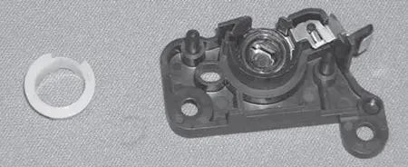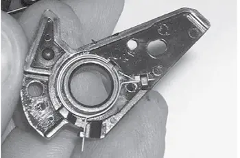 18. Очищают крышку контактной группы магнитного вала от тонера и загрязнений. Извлекают из крышки белую втулку, в которой вращается вал, и очищают ее от старой смазки и тонера (рис. 28).
