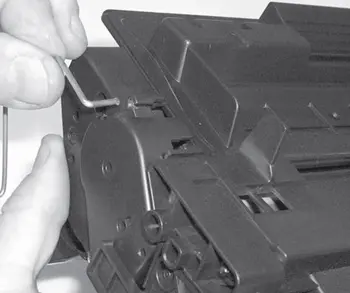 9. Осматривают оболочку магнитного вала. Обращают внимание на кольцевые канавки, механические повреждения поверхности и износ. При выявлении дефектов и учитывая качество покрытия тонером оболочки магнитного вала перед очисткой, а также качество распечатки, полученной перед заправкой, заменяют оболочку магнитного вала в следующей последовательности: