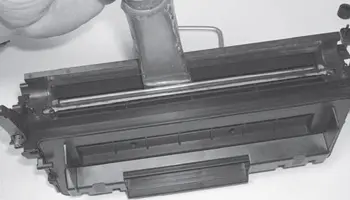 12. Высыпают остатки тонера из заправочного бункера в бумажный лоток или полиэтиленовый пакет и пылесосом тщательно очищают заправочный бункер, магнитные уплотнители вала, дозирующего лезвия и уплотняющее лезвие пылесосом. При очистке исключают прикосновения насадкой пылесоса к уплотняющему лезвию и к клейкому уплотнителю дозирующего лезвия. При необходимости очищают корпус второй половины картриджа.