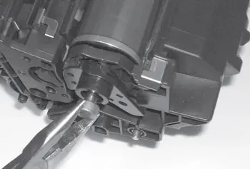 Рис. 4. Плоской отверткой отодвигают шторку вместе с осью фотобарабана