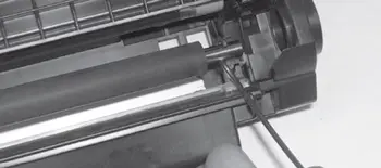 4. Наносят тонкий слой литиевой смазки на пластмассовую ось фотобарабана и устанавливают его на место. Порядок установки фотобарабана обратен порядку его снятия. Припудренную полоску располагают по чистящему лезвию. Большая часть полосы (ориентировочно 3/4 от ширины) должна быть расположена до чистящего лезвия по ходу вращения при работе.