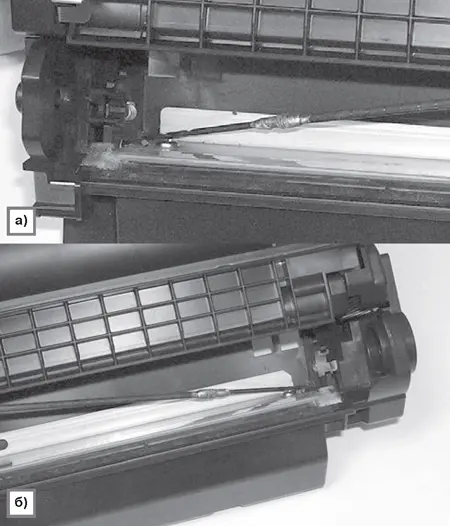 3. Осматривают уплотнения по краям бункера отработки между корпусом картриджа и фотобарабаном, и чистящим лезвием. При осмотре обращают внимание на качество приклейки уплотнений к корпусу и состояние их рабочих поверхностей. При обнаружении повреждений производят замену уплотнителей.
