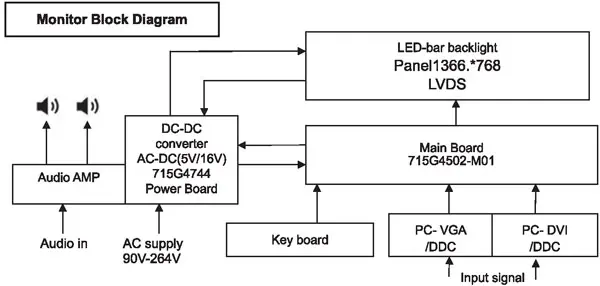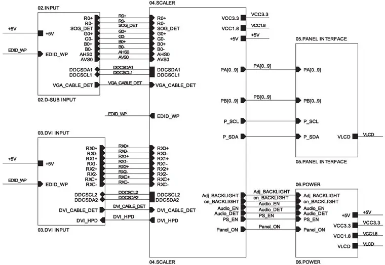 На рис. 6 приведена схема распределения сигналов и напряжений между узлами монитора: входными цепями (02.INPUT и 03.DVI INPUT), микропроцессором (04.