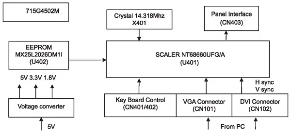 На основной плате располагается микропроцессор (МП) U401 SCALER NT68660UFG/A, основной задачей которого является обработка входных сигналов монитора и преобразование их в сигналы управления ЖК панелью. С МП связаны микросхема Flash-памяти U402 EEPROM и кварцевый резонатор Х401 Crystal (частота 14,318 МГц).