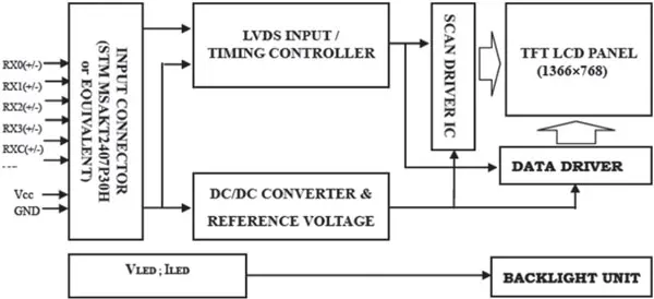 На контроллер LVDS INPUT/ TIMING CONTROLLER через контакты входного разъема INPUT CONNECTOR поступают LVDS-сигналы RX0(±), RX1(±), RX2(±), RX3(±), ряд вспомогательных сигналов и напряжение питания VCC. Сформированные контроллером сигналы подаются на драйверы данных DATA DRIVER и разверток SCAN DRIVER, которые формируют изображение в ЖК панели TFT LCD PANEL.
