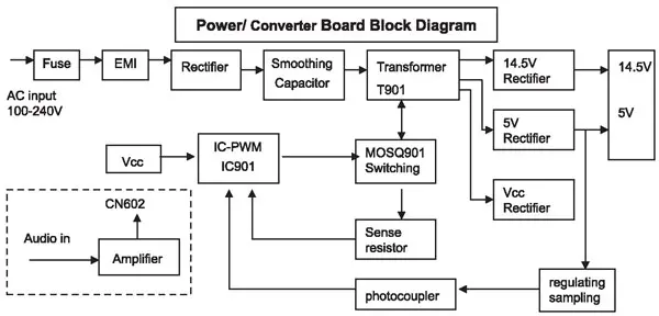Напряжение питающей сети 100...240 В после предохранителя Fuse и фильтра EMI выпрямляется мостом Rectifier, после чего заряжается накопительный конденсатор Smoothing Capacitor. К конденсатору подключена цепь из последовательно соединенных первичной обмотки трансформатора Т901 Transformer, полевого транзистора Q901 Switching и токового датчика (резистора) Sense resistor. Через затвор транзистор переключается выходными импульсами микросхемы IC-PWM IC901, скважность которых изменяется под воздействием сигнала обратной связи, поступающего с токового резистора и с выхода оптрона Photocoupler.