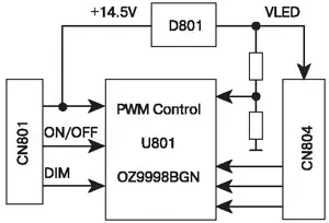 Через контакты разъема CN801 на контроллер PWM Control U801 подается напряжение питания + 14.5V, сигнал включения/выклю-чения инвертора ON/OFF и сигнал регулировки яркости свечения DIM. Сформированное напряжение питания VLED через контакты разъема CN804 подается на линейки светодиодов задней подсветки (LED-линейки). Показанные на рисунке стрелками четыре входа контроллера обеспечивают протекание токов на общий провод через разные группы последовательно соединенных светодиодов. Интенсивность этих токов определяется уровнем сигнала DIM и ШИМ модуляцией в контроллере. При чрезмерном токе через LED-линейки происходит блокировка контроллера, чем обеспечивается токовая защита. Защита от перенапряжения включается при чрезмерном превышении напряжения питания (в этом случае команда отключения контроллера подается на него с центральной точки показанного на рисунке резистивного делителя).