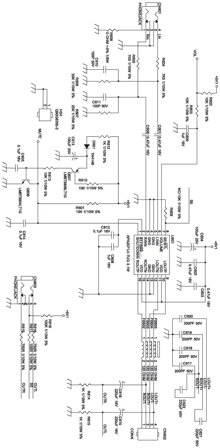 Стереосигналы звука Lin, Rin через контакты разъема CN601 и входные цепи подаются на выв. 6, 3 микросхемы U601 типа APA2071JI-TUG фирмы ANPEC, являющейся усилителем мощности 3,1 Вт звуковой частоты с регулируемой громкостью. Сигналы LOUT±, ROUT± с выв. 11,9, 14, 16 микросхемы через контакты 4, 3, 2, 1 разъема CN602 соответственно подаются на расположенные в футляре монитора динамические головки. Через контакты гнезда CN603 имеется возможность подключения стереофонических головных телефонов.
