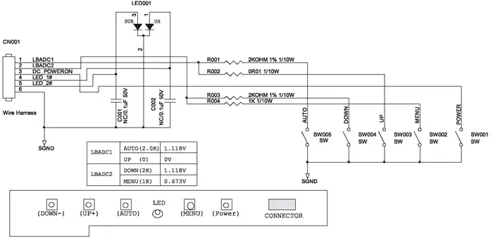 На ней расположены кнопки управления SW001 (POWER), SW002 (MENU), SW003 (UP), SW004 (DOWN), SW005 (AUTO). Эти кнопки через контакты 3, 2, 1 разъема CN001 соединены с выв. 90 (POWER), 82 (KEY1), 83 (KEY2) микропроцессора U401.