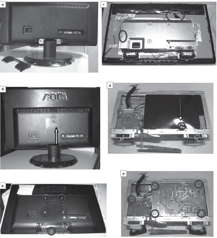 3.Кладут монитор экраном вниз на стол, не забывая подложить под него мягкую ткань. Отворачивают винты, как это показано на рис. 16в, и снимают заднюю крышку.