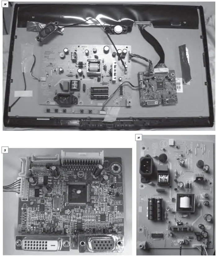 6.Отворачивают винты, обведенные на рис. 16е кругами, и извлекают платы и динамические головки (рис. 16е-и).