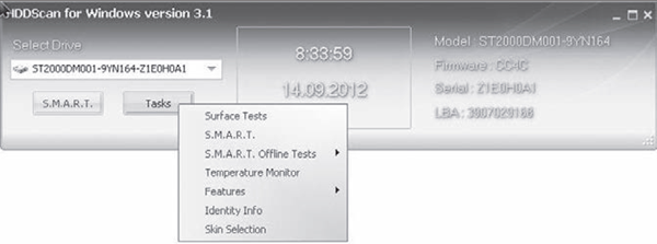 Ниже выпадающего списка выбора HDD находятся кнопки SMART и Tasks. Первая служит для просмотра информации SMART выбранного накопителя, а вторая - для вызова субменю проверки жесткого диска (рис. 13).
