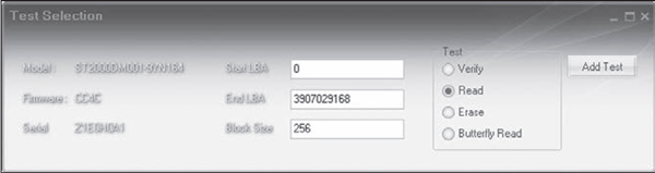 - "Read", накопитель считывает данные во внутренний буфер, после чего данные передаются через интерфейс и сохраняются во временном буфере программы. Программа измеряет суммарное время готовности HDD, время передачи данных после каждого блока и выводит результаты. Блоки тестируются последовательно, от минимального номера к максимальному.