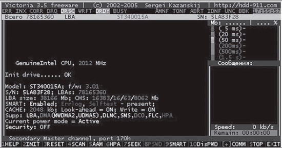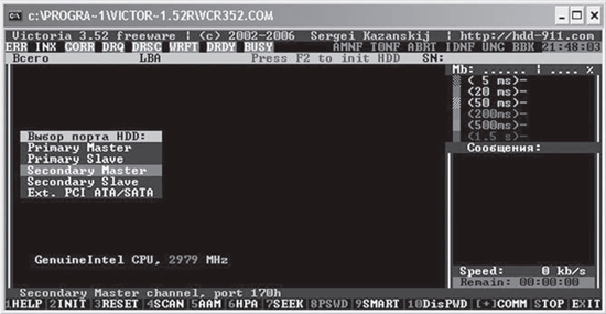 Выбор производится клавишами управления курсором "вверх" и "вниз", а подтверждение клавишей Enter. При перемещении курсора в реальном времени включаются индикаторы в окне программы (строка под версией программы на рис. 2), что позволяет судить о готовности HDD. У исправного накопителя всегда будут светиться индикаторы DRSC и DRDY у некоторых может еще и светиться индикатор NX. В регистрах ошибок может быть включен индикатор AMNF (красного цвета), а остальные должны быть погашены. После установки курсора на нужный пункт нажимают Enter.