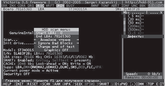Рис. 4. Меню сканера поверхности HDD